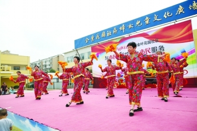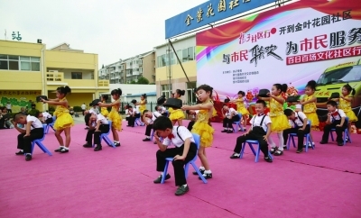 当天的活动,由金叶花园幼儿园老师们带来的时尚“韩舞”《Gee》拉开帷幕。“小宝贝我用彩虹和你约定,风雨过后阳光会微笑,平安地长大,迎接希望的未来!”金叶花园幼儿园的两位老师盛缓和周亚玲为孩子们演唱了这首歌,不少台下的小朋友跟着哼唱,有个小朋友还跑过去拉着盛缓的手说:“老师,你放心,我一定像彩虹一样快乐地长大!”金叶花园幼儿园的另一位老师王洪琳也演唱了一首《跟着感觉走》,王老师说这首歌不仅送给学生,也送给每一个有梦想的金叶花园社区居民,希望每一个在追求梦想路上的人都能够紧紧地抓住梦的手。