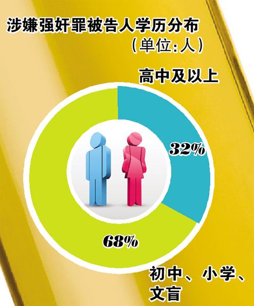 据海珠区法院统计,2012年至2014年10月97个涉嫌强奸罪的被告人中,20岁以下12人,占12.4%,20岁至40岁77人,占79.4%,40岁以上8人,占8.2%。高中以上文化程度31人,占32.0%,其中本科、专科23人;初中、小学、文盲66人,占68.0%。