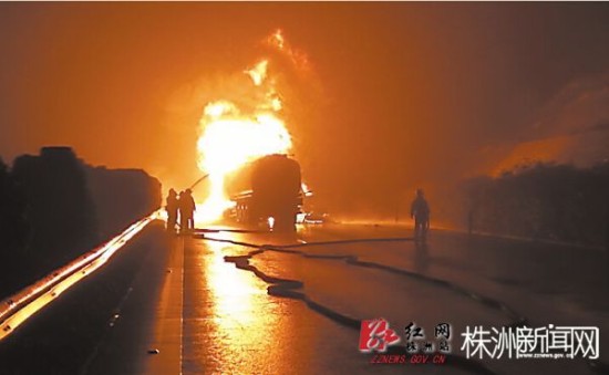 事发后,天元区栗雨消防中队出动两辆消防车赶往现场,消防队员在现场5公里外就看到火光冲天,株洲高速交警对事故路段的南北双向车道实施封锁。