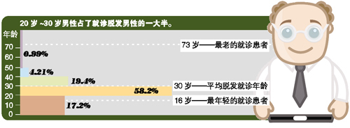 全国皮肤病名老专家、广东省皮肤性病防治中心主任医师顾有守教授说,全国、广东、广州至今没有非常权威的男性脱发发病率数据,因该疾病未被纳入流行病学调查。倒是有一份相对可靠的不完全统计:一份发表在国外医学文献的文章称,在中国6大城市,多家医院共约700例皮肤病人的门诊数据统计,21.3%男性有脱发问题,即5个男性中就有一人被脱发困扰,这相当残酷。顾教授强调,这是门诊统计,并不是男性全人群调查。