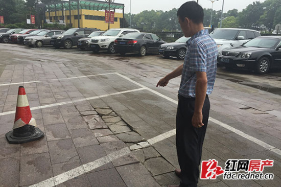 (万达公馆商铺业主指着被进出车辆压坏的地面非常无奈。)
