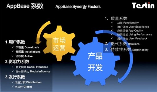 AppBase实力象限(Testin AppBase Synergy Quadrant)根据移动App市场运营、产品开发这两个重要属性的14项维度进行分类分析,提供了化繁为简的App实力市场、运营、产品、研发的提升决策方法(App Synergy Factors Decision Tools),以便精确发现App开发者最为困惑的发展策略问题中所存在的问题,以客观的决策依据评估一个App相对其垂直领域内的同类型App的综合实力、以至相对于任何一个App的竞争态势,制定产品开发、市场运营均衡的发展策略,用来判断投入产出效果的总体影响、投资回报等静态比较和变化趋势,最终建立长期、持续的实力,同时向行业人士和投资人提供了用来评判App的综合协同发展潜力的依据。