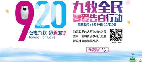 9月20日至10月10日期间,九牧在移动端与PC端同步开启以“智惠九牧,致爱的你”为主题的“920全民智爱告白”活动,网友只需扫描相关二维码进入填写“智爱宣言“即可参与,九牧将替你传递爱意!