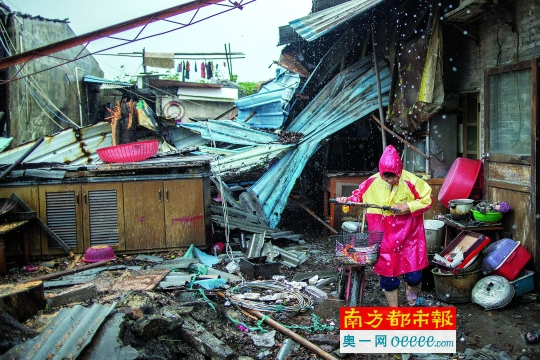 罗边村一个面积超过2000平方米的废品站被吹塌大部分,工人在冒雨收拾物品。
