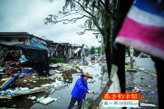 罗边村是整个龙卷风肆虐的重灾区。实发市场外一位被叫来清理杂物的师傅对记者说,前天龙卷风从余荫山房一直往西北方向刮来,前后大约持续了5分钟。这短短的5分钟,实发市场里的景象就像被轰炸过一般:一大半简易的防雨棚已经被撕得没有一片完整的,有的钢架直接砸到了停放在下面的三轮车,地上仿佛被洗劫过,满地都是垃圾和杂物。