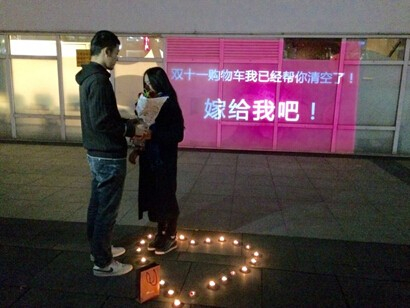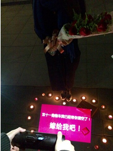 这件事就发生在昨晚,地点是北京CBD某商务办公楼楼下。记者接到热心市民电话赶到现场时,就看到了照片上的这一幕。女子站在用蜡烛围成的心形圈里,男子单膝跪地,手里举着一束鲜花,在女子背后有个投影,上面写着:双十一购物车我已经帮你清空了,嫁给我吧!只是记者当时不明白,为何在心形圈旁还放了一个类似保温杯的东西。