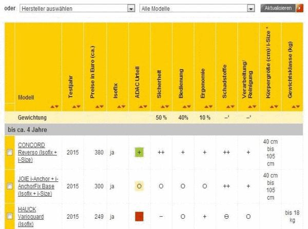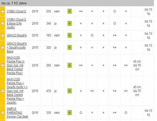 首先来看最受关注的婴儿组0-4岁组别,在国外新生儿都会选用这个组别,该组别也显示了安全座椅品牌在安全领域的最高水准,一般品牌不太敢参加这个组别,很容易就fail,今年德国HAUCK就挂了,而第一名是CONCORD REVERSO得到了ADAC评价为"好",是同组别最好的评价。这个德国牌子简直就是安全座椅领域的神,每年都选择一款参加测试,每次都是参赛组别的第一名。