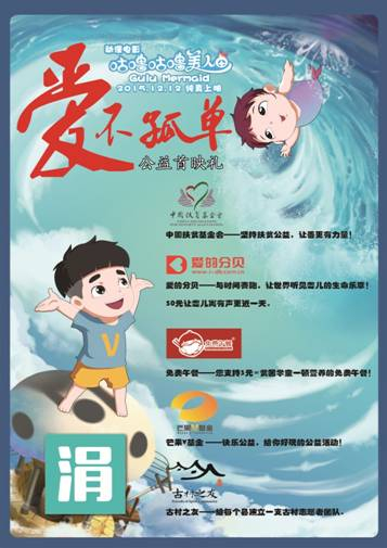 《咕噜咕噜美人鱼》片方今日确认将联合涓涓互助公益平台、中国扶贫基金会、爱的分贝、免费午餐、芒果V基金、古村之友等公益机构,于2015年12月5日、6日在北京、广州、深圳、杭州、长沙5大城市同时举办“爱不孤单”公益首映礼。