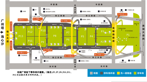事实上,花城广场地下停车场分划成13个停车库,从P1到P13车库由北往南按顺序分布。13个停车库之间相互独立,并不相互贯通,它们之间靠一条地下环道连接,车辆顺着地下环道,可进入各个停车库。