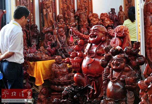 资料图:一名参观者在观赏越南红木制品。新华社记者 陈瑞华 摄