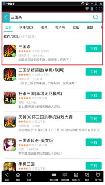 2. 安装一玩模拟器,安装完成后点击“360手机助手”,在360手机助手上搜索游戏“三国杀”,并下载安装。