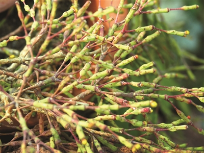 记者看到平日里流行的“圣诞红”也放置在此。难道这也是“猴植物”?李梅博士说,这种植物其实叫做“猩猩木”,叶子恰好在圣诞期间变红,丽若云霞,是西方装点圣诞节不可缺少的佳卉。她还特意告诉记者,通常我们以为的花朵其实是花瓣状的顶叶,真正的花朵隐藏在顶叶中间。展区还有几株植物堪称最文艺“猴植物”。一种附生仙人掌原产巴西,叶已全部退化变成纤细的圆柱状茎,酷似一个个首尾相连的迷你威士忌酒瓶,所以英文名字之一叫做“醉汉之梦”。而传到中国,则被有才的人们称作猿恋苇,一只猿猴恋上一株芦苇,就像小王子爱上玫瑰,听上去有种别出心裁的浪漫。