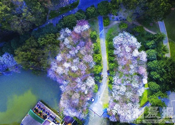 3月1日,望月公园铜盆湖边,上百株盛开的樱花树从高空俯瞰,形如人肺。图/潇湘晨报记者辜鹏博