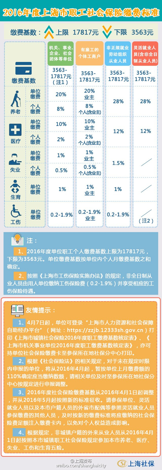 中新网4月6日电 据上海市政府新闻办公室官方微博消息,上海市人社局今日发布,2016年度上海市职工社保缴费基数自4月1日起调整,上下限分别调整为17817元和3563元。2016年5月起,将按照新的标准征收。