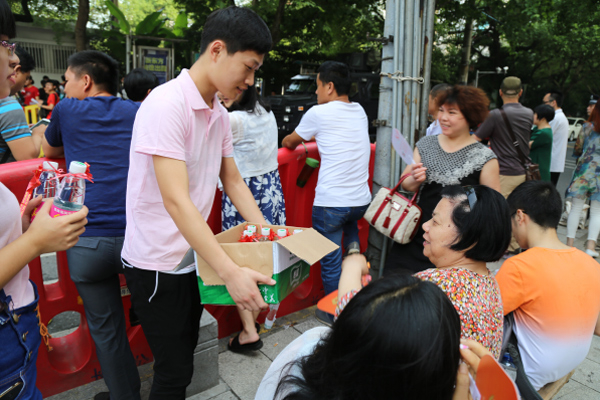 考生们进入考场后,对于父母们来说等待是件焦灼、辛苦的事情。雅美爱心送水员真诚地为他们递上一瓶瓶矿泉水,安慰他们不要焦急,更陪着家长们聊天解闷,谈一谈孩子,聊一聊学习,缓解家长们的紧张之情。考生朱小月(化名)的妈妈说,“感谢像雅美这样的单位,能够义务提供这么贴心的服务,内心非常感动”。