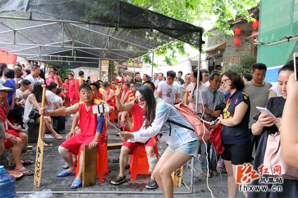 游客与龙舟赛选手合影