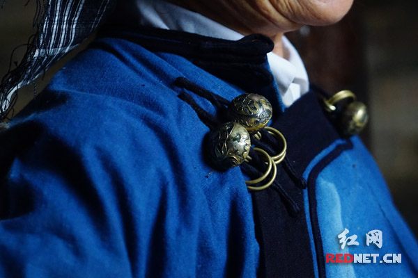 或金或银的扣饰是瑶家妇女的传家宝,要一代代继承下去。李柳音身上的扣子是她当年的嫁妆,她已经数不清传到她这一代经历过多少年了。即便经过岁月洗礼,但仍看得出当时精致的手工技艺,扣子虽小却象征了每个家庭的实力和荣耀。与扣子一起陪嫁的还有簪子、耳环、腰间银链、手镯、针筒,共6样金银物品。
