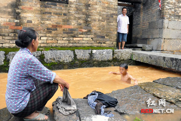 夏日孩童们在溪水中跳水打闹,妇女们在溪边盥洗衣物。