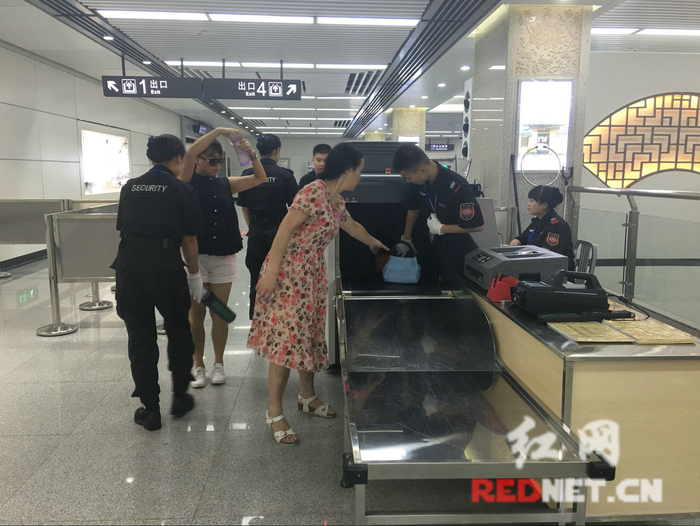 红网长沙7月30日讯(实习生 卢欣 时刻新闻记者 彭双林)“包请过一下安检,水也要喝一口。”7月30日,在长沙地铁一号线的省政府站,安检员对市民说。一位老人的包过安检机时,机器发出警报声,打开才发现是一个水壶。虽然只是老人为孙子准备的普通水壶,安检员还是用仪器认真检查了一遍才放行。