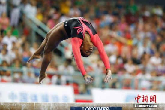 资料图:美国选手拜尔斯(BILES Simone)参加比赛。中新社发 盛佳鹏 摄