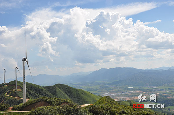图为东岗岭上的风力发电项目,从这里可以俯瞰到汝城大坪镇。