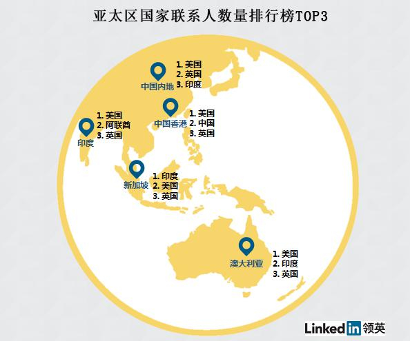 LinkedIn(领英)数据表明,从联系人数量上来看,英、美两国均被列入与亚太地区国家职场人联系人数最多的前三名国家当中,成为与亚太地区联系最紧密的国家,其中与中国职场人的联系人数量更是分列一、二两名。