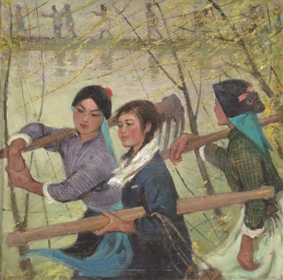 尽管表现的是肩挑工具的劳动场面,但人物形象并无壮硕、艰苦之感,而依旧带有女性的柔美,她们的簪花头巾,扬起的衣袂,沉静的面庞与春风和煦的环境相得益彰,洋溢着活力与柔和的诗情画意。西方的写实传统和富有时代气息的人物形象最终都融合在充满诗性和东方美的画面氛围中。