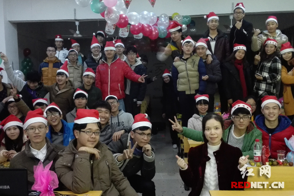 资料图:江建(前排右一)和学生们一起过圣诞节。