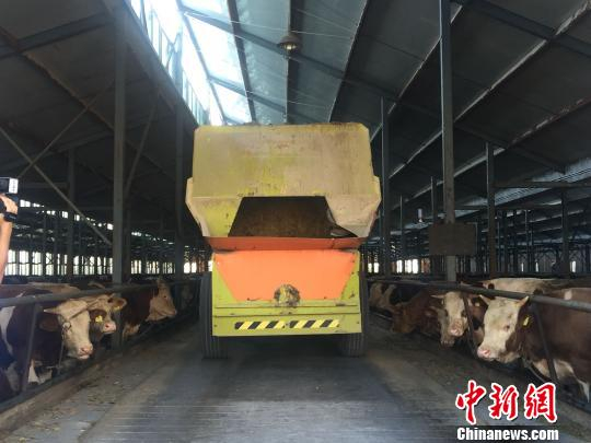 图为工作人员正开着饲草拖拉机给牛喂料。 乌瑶 摄