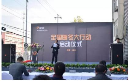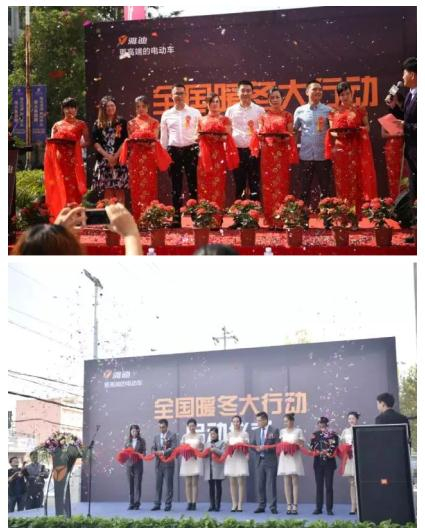 11月4日,2016雅迪全国暖冬大行动启动仪式在江苏泰州、广东吴川同时启动,拉开了2016年雅迪全国暖冬大行动的序幕。