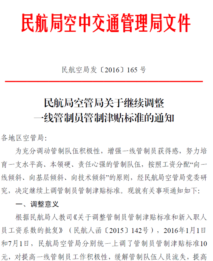 在2016年1月1日和7月1日,民航局空管局已经分别统一上调了管制员管制津贴标准10元,而此次的不同是针对不同管制单位、不同管制员级别,实行了差异化上调管制津贴标准,以在一定程度上体现区域差异和劳动贡献。