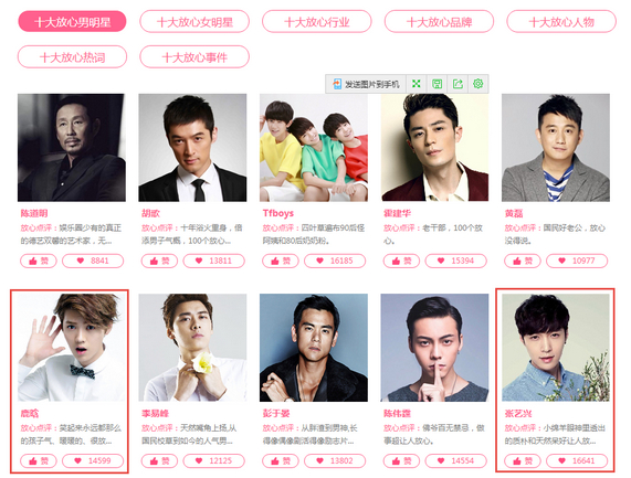 2016年底,国内知名搜索引擎360搜索基于今年网民搜索热度分析,上线了年度盘点专题--- “放心盛典”大型榜单评选活动,其中包括了放心榜和闹心榜两大体系。在放心榜板块甄选中,因鹿晗和张艺兴二人多才多艺,很少有负面新闻,入围360放心盛典。作为EXO前成员的吴亦凡和黄子韬,却未能入围360搜索的放心男明星排行榜。