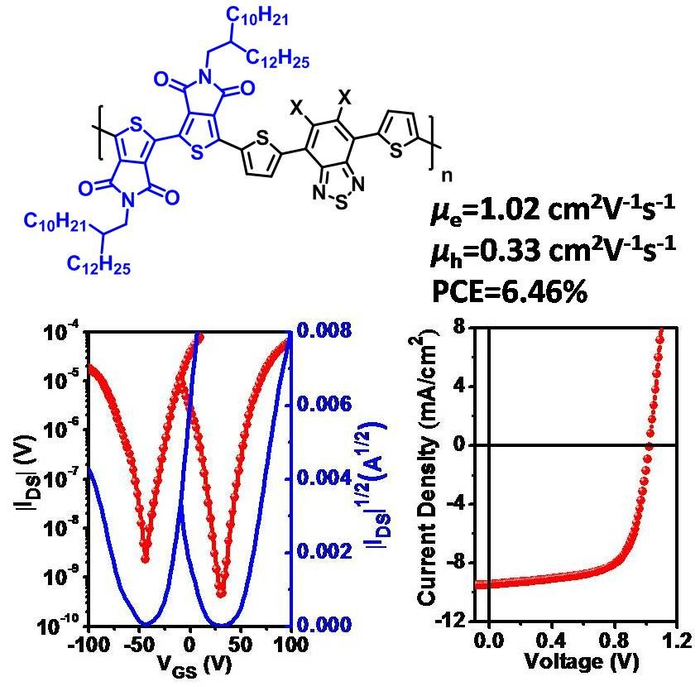 图2. 双噻吩酰亚胺聚合物的结构式及其晶体管器件转移曲线和太阳能电池I-V曲线。