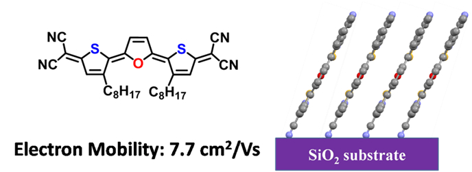 图1. 呋喃-噻吩醌式分子的结构式及其在器件中的堆积结构。