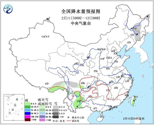 11日08时至12日08时,新疆北疆北部、西藏东南部、川西高原中部、黑龙江东北部和南部、吉林东部等地部分地区有小到中雪或雨夹雪;四川盆地西南部、云南东部、台湾东部等地有小雨或阵雨。