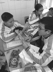 课堂上,老师们反而轻松,一节课的出场时间最多15分钟,其余时间让位学生。金中外实校的课堂均为小组合作制,教师沈海艳利用小游戏“开火车”动员内向学生回答问题;投影仪、电子白板则作为学生展示练习成果的舞台;组内设有小老师,负责组员的个别辅导。学生在课上练习、展示的时间保持在23分钟以上,课后教研组建立“半小时作业库”,精选习题,将作业量严格控制在半小时。