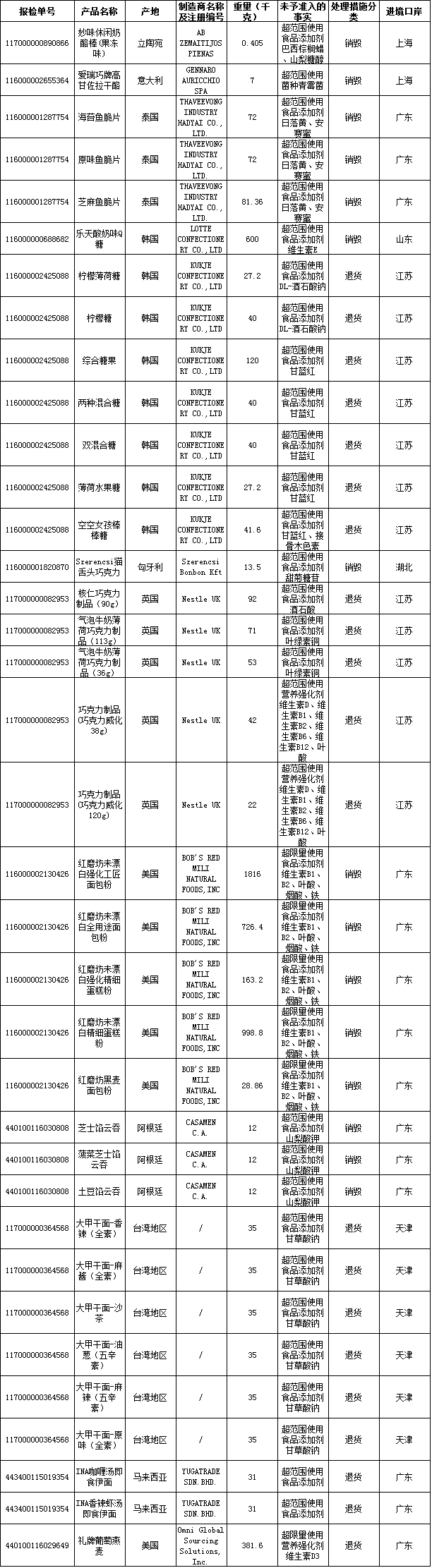 105批进口食品超范围、超限量使用食品添加剂