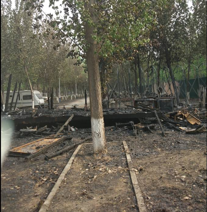 5月2日,中午11:30点左右,每日经济新闻(微信号:nbdnews)记者抵达北京朝阳区东苇路蟹岛度假村停车场,发现起火事故现场已经被塑料遮挡物围起。