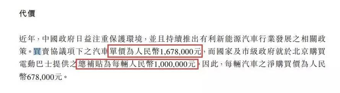 买卖协议项下的汽车单价为人民币167.8万元,而国家及市级政府就于北京购买电动巴士提供的总补贴为每辆人民币100万元。因此,每辆汽车的净购买价为人民币67.8万元。
