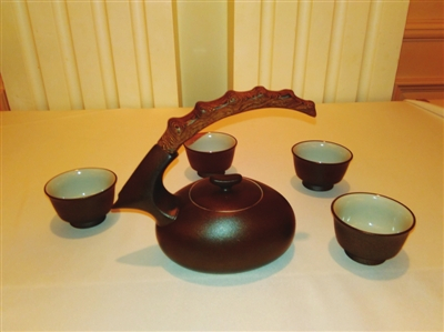 参赛作品中的一套茶具,其陶瓷壶的提把手是用北山羊羊角做成的 石承烈摄