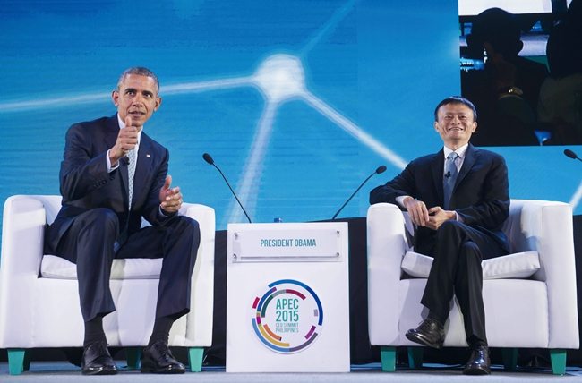 2015年11月18日,在菲律宾举行的APEC工商领导人峰会上,马云与时任美国总统奥巴马展开对话。