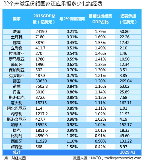 第一财经记者按照这22个国家2015年的GDP总量为标准,再比照其距离2%分摊份额的缺口,不难得出一个结果,即22个国家一共要多缴纳1029亿美元才能满足要求,美国也能因此减轻“负担”。