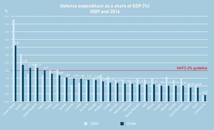 从北约公布的2016年年报来看,目前只有美国、希腊、爱沙尼亚、英国和波兰缴足GDP2%的份额,另有19个国家目前的军费开支水平在1%~2%之间,比利时、西班牙和卢森堡均低于1%,中位数为1.21%。(由于冰岛不设军队,由美国负责其防务,因此未纳入统计。)