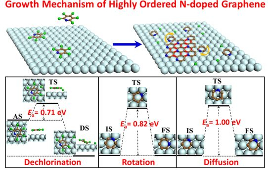 近日,中国科学技术大学合肥微尺度物质科学国家实验室国际功能材料量子设计中心崔萍博士与李震宇教授、曾长淦教授等校内外同行合作,在氮掺杂石墨烯生长的原子尺度机理研究方面取得重要进展,通过理论计算预言了利用芳香性分子C5NCl5在Cu(111)表面上可自组装实现高浓度、高有序的氮掺杂石墨烯。该研究成果以“A Kinetic Pathway toward High-Density Ordered N Doping of Epitaxial Graphene on Cu(111) Using C5NCl5 Precursors”为题5月12日在线发表在《美国化学会志》[J. Am. Chem. Soc. 2017. DOI: 10.1021/jacs.6b12506]。