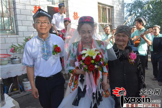 婚礼当天,新郎李运运和村里的伴郎团们身着维吾尔族传统服饰,坐着极具民族特色马车,去村里亲戚家迎娶心中最美的新娘。在新娘婚房里,新郎、新娘一同吃馕沾盐水,新郎喝冰糖茶、吃羊胸脯肉等极具民族风俗的环节,让两位新人明白婚姻需要同甘共苦,相互扶持到老。亲戚再乃普汗·毛来科为新娘送上自己精心准备的艾德拉斯丝巾和小花帽,亲手为她戴上红盖头。