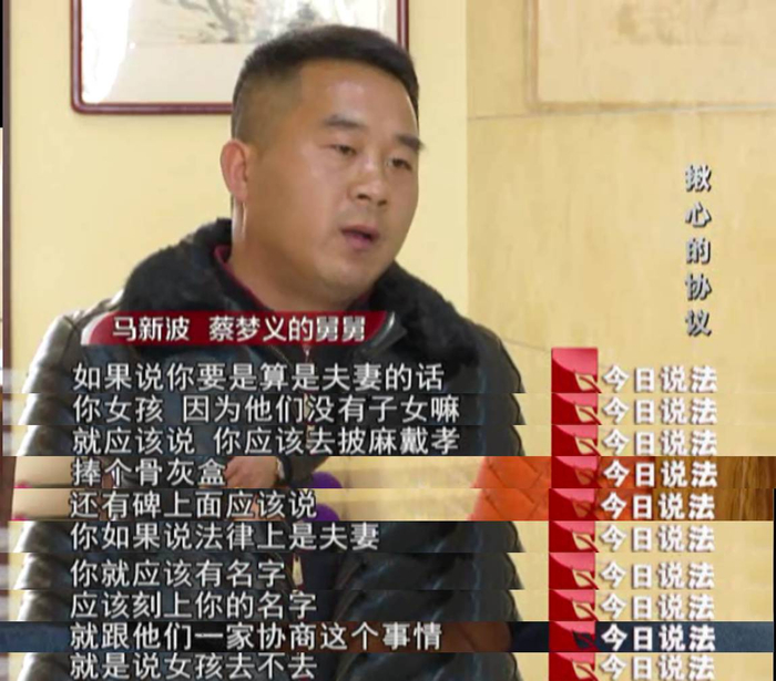 双方协商时,欣怡的父亲表示,办丧事时蔡家人很照顾欣怡,没让她参加,墓碑上也没有刻欣怡的名字,既然蔡家人这么让步,那在遗产上,他们也不争了,一分钱也不要,而蔡家呢,觉得这样做太亏欠欣怡了,主动提出要给欣怡10万元。