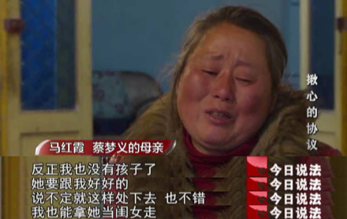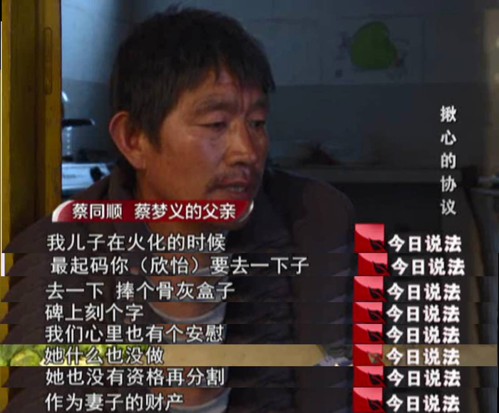 欣怡说,蔡梦义的死对她打击很大,那一段时间她天天魂不守舍,在这种情况下蔡家人拿了一张纸,让她在上面签字说是办户口用,她看都没看就把字签了,等后来她才发现这是一份不公平的《协议》,一气之下她才把公公婆婆给告了。