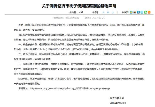 声明表示,临沂及周边的桃绝无应用防腐剂的现象,