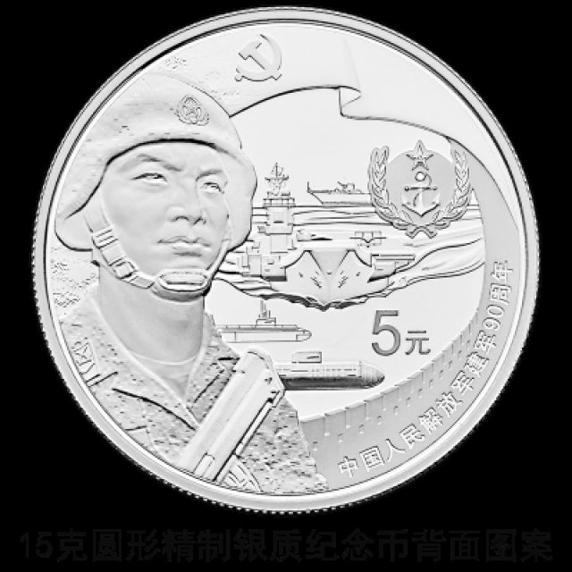 15克圆形银质纪念币背面图案之二为党旗下的海军军人形象配以典型武器装备、军兵种臂章图案、长城造型等组合设计,并刊“中国人民解放军建军90周年”字样及面额。