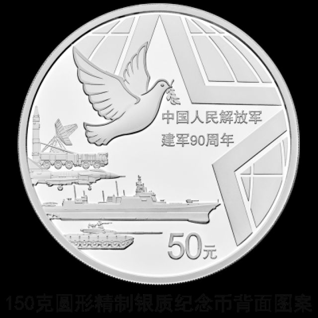 150克圆形银质纪念币背面图案为陆军、海军、空军、火箭军、战略支援部队典型武器装备以及地球、和平鸽图形等组合设计,并刊“中国人民解放军建军90周年”字样及面额。